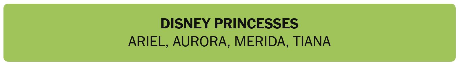 - DISNEY PRINCESSES – ARIEL, AURORA, MERIDA, TIANA