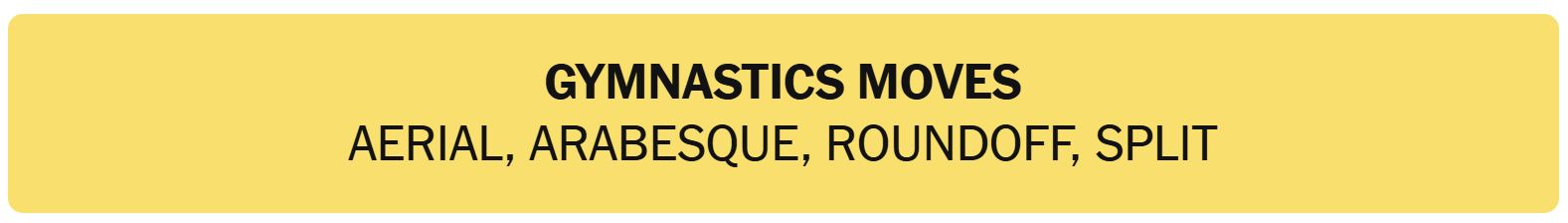 - GYMNASTICS MOVES – AERIAL, ARABESQUE, ROUNDOFF, SPLIT