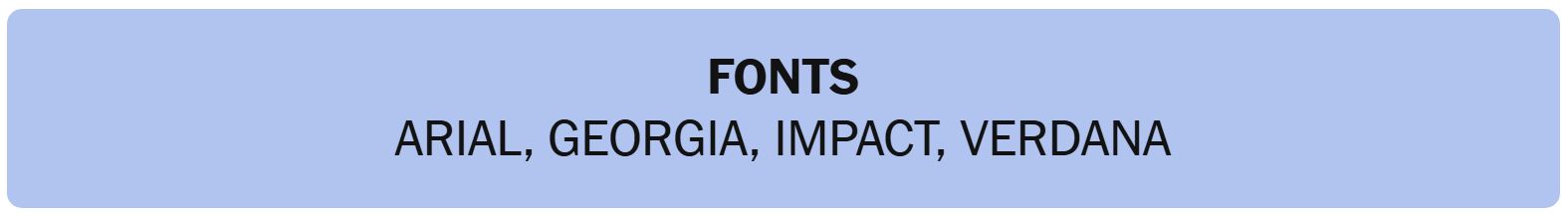 - FONTS – ARIAL, GEORGIA, IMPACT, VERDANA