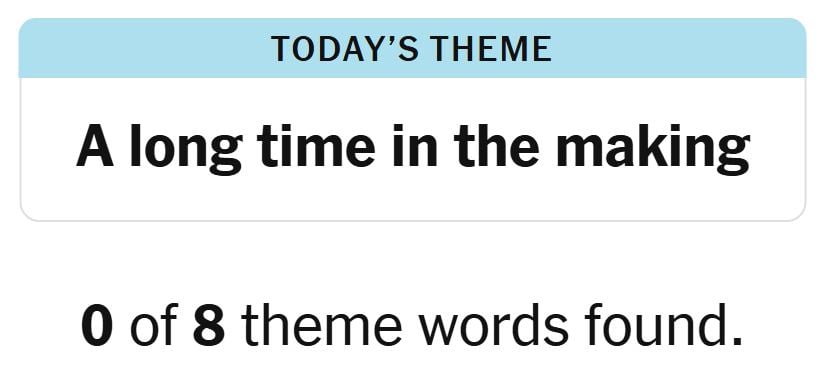 Today’s theme or hint for the puzzle is, “A LONG TIME IN THE MAKING” and there are eight theme words to be found.