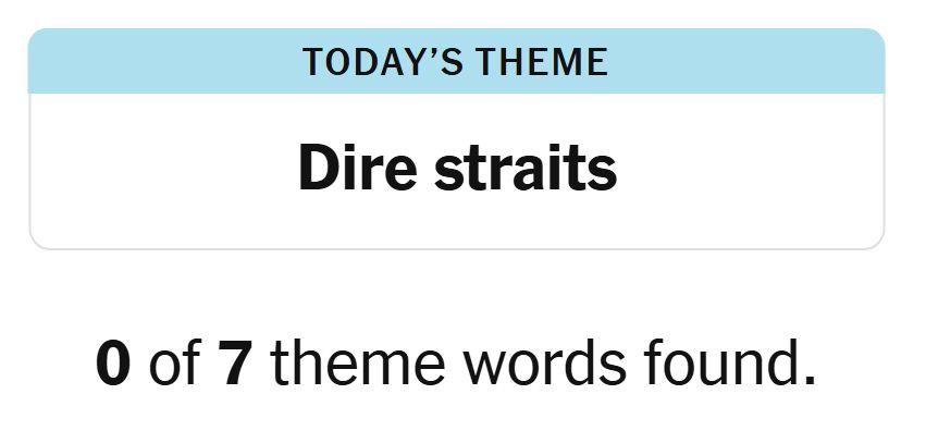 Today’s theme or hint for the puzzle is, “DIRE STRAITS” and there are seven theme words to be found.