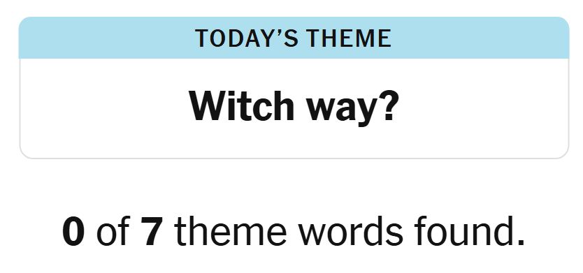 Today’s theme or hint for the puzzle is, “WITCH WAY?” and there are seven theme words to be found.