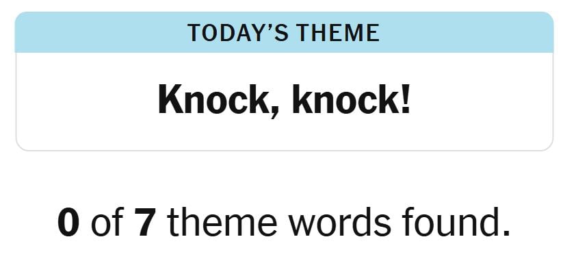 Today’s theme or hint for the puzzle is, “KNOCK, KNOCK” and there are seven theme words to be found.