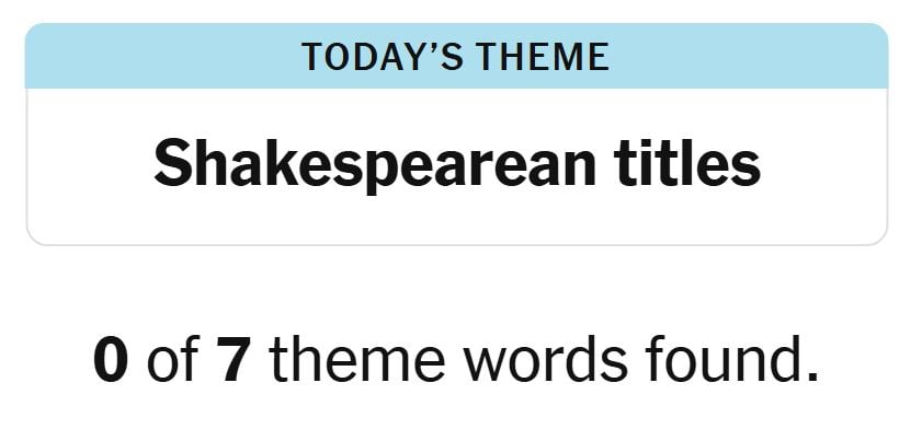 Today’s theme or hint for the puzzle is, “SHAKESPEAREAN TITLES” and there are seven theme words to be found.