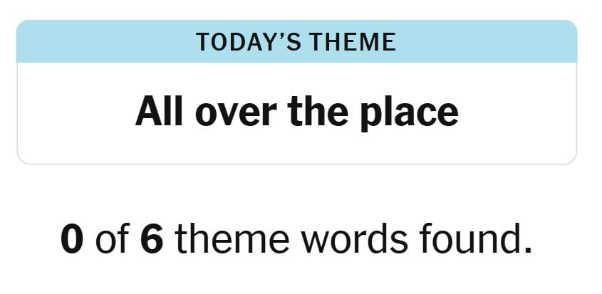 Today’s theme or hint for the puzzle is, “ALL OVER THE PLACE” and there are six theme words to be found.