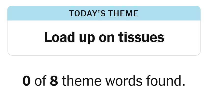 Today’s theme or hint for the puzzle is, “LOAD UP ON TISSUES” and there are eight theme words to be found.