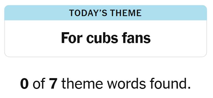 Today’s theme or hint for the puzzle is, “FOR CUBS FANS” and there are seven theme words to be found.