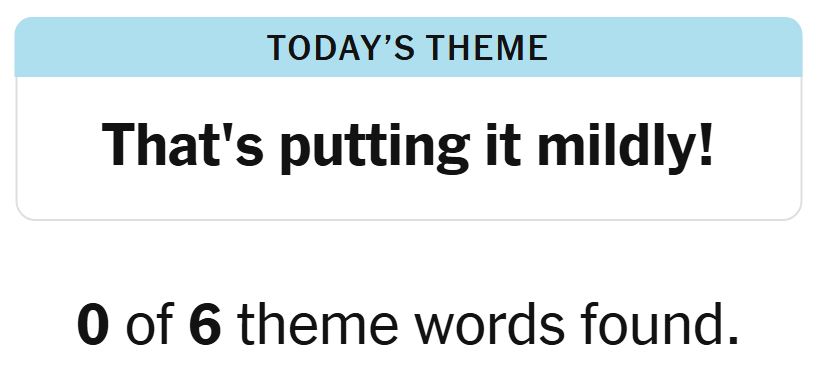 Today’s theme or hint for the puzzle is, “THAT’S PUTTING IT MILDLY!” and there are six theme words to be found.