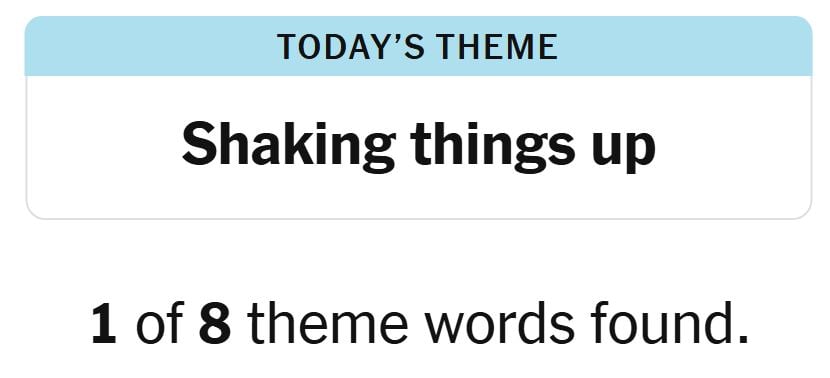 Today’s theme or hint for the puzzle is, “SHAKING THINGS UP” and there are eight theme words to be found.