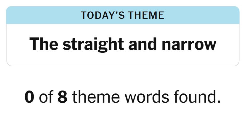 Today’s theme or hint for the puzzle is, “THE STRAIGHT AND NARROW” and there are eight theme words to be found.
