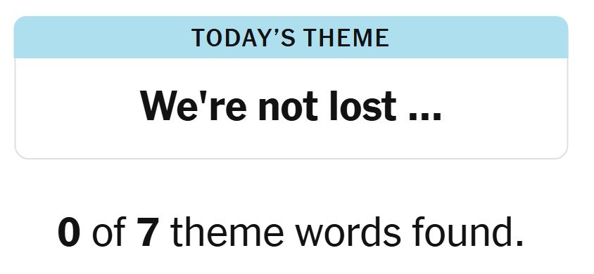 Today’s theme or hint for the puzzle is, “WE’RE NOT LOST…” and there are seven theme words to be found.