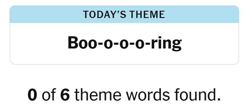 Today’s theme or hint for the puzzle is, “BOO-O-O-O-RING” and there are six theme words to be found.