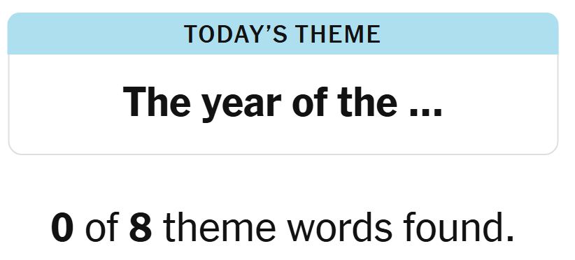 Today’s theme or hint for the puzzle is, “THE YEAR OF THE …” and there are eight theme words to be found.