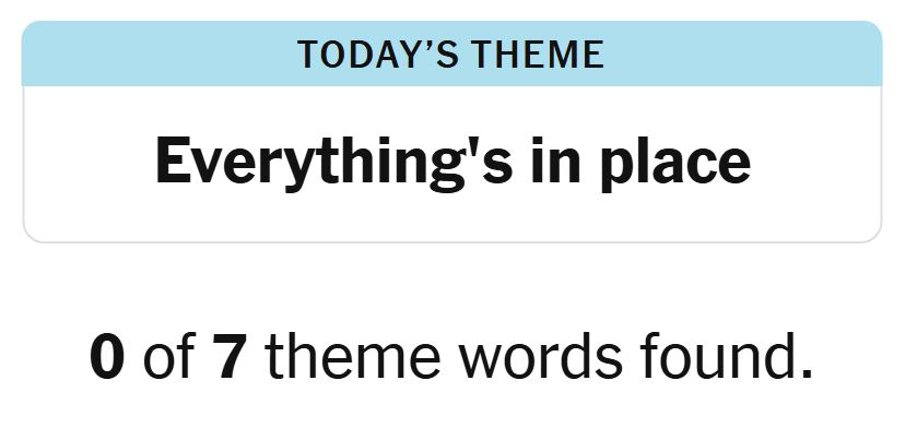 Today’s theme or hint for the puzzle is, “EVERYTHING’S IN PLACE” and there are seven theme words to be found.