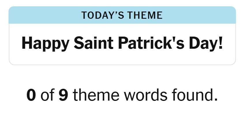 Today’s theme or hint for the puzzle is, “HAPPY SAINT PATRICK’S DAY!” and there are nine theme words to be found.