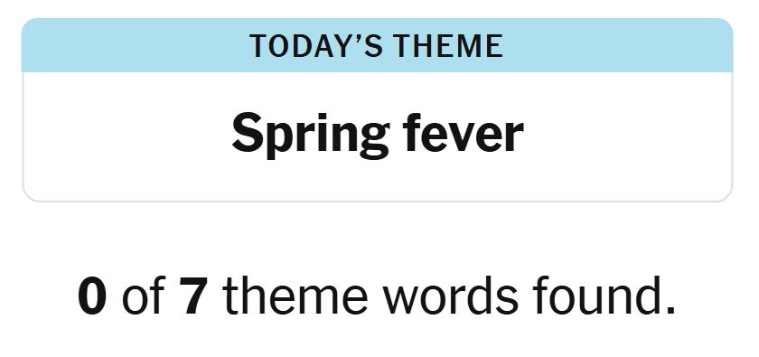 Today’s theme or hint for the puzzle is, “SPRING FEVER” and there are seven theme words to be found.