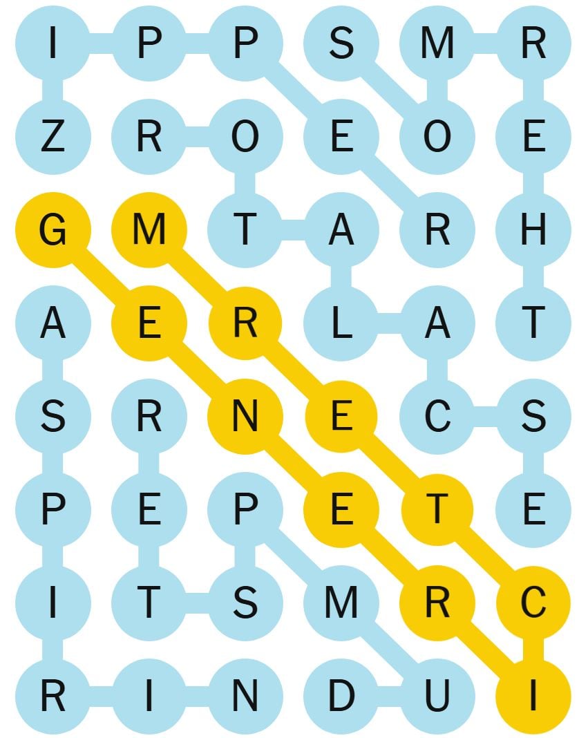 The word starts on the left side of the grid, hits the bottom right corner and ends next to the start of the Spangram.