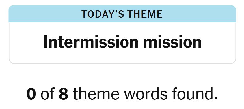 Today’s theme or hint for the puzzle is, “INTERMISSION MISSION” and there are eight theme words to be found.