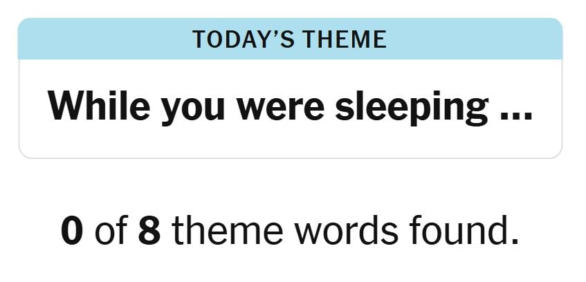 Today’s theme or hint for the puzzle is, “WHILE YOU WERE SLEEPING…” and there are eight theme words to be found.