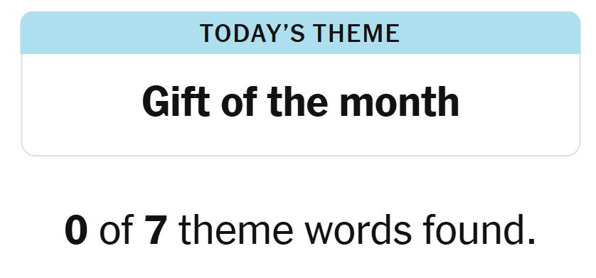 Today’s theme or hint for the puzzle is, “GIFT THE MONTH” and there are seven theme words to be found.