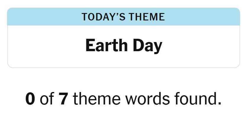 Today’s theme or hint for the puzzle is, “EARTH DAY” and there are seven theme words to be found.