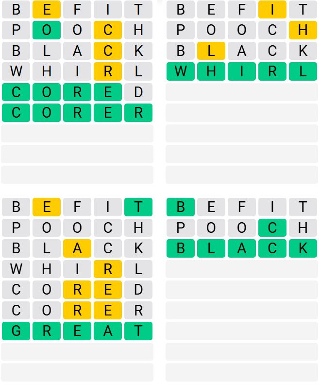 It is the most popular daily word game outside of Wordle due to the increased level of difficulty. Players must guess four five-letter words in as few as nine attempts, rather than guessing one word.