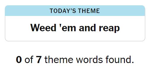 Today’s theme or hint for the puzzle is, “WEED ‘EM AND REAP” and there are seven theme words to be found.