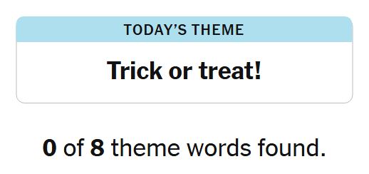 Today’s theme or hint for the puzzle is, “TRICK OR TREAT!” and there are eight theme words to be found.