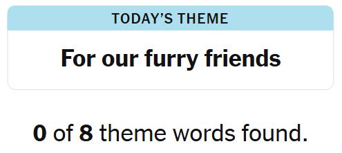 Today’s theme or hint for the puzzle is, “FOR OUR FURRY FRIENDS” and there are eight theme words to be found.