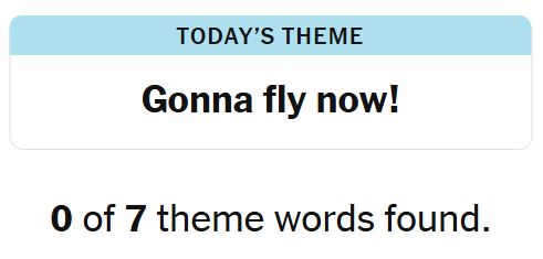 Today’s theme or hint for the puzzle is, “GOTTA FLY NOW!” and there are seven theme words to be found.