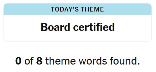 Today’s theme or hint for the puzzle is, “BOARD CERTIFIED” and there are eight theme words to be found.