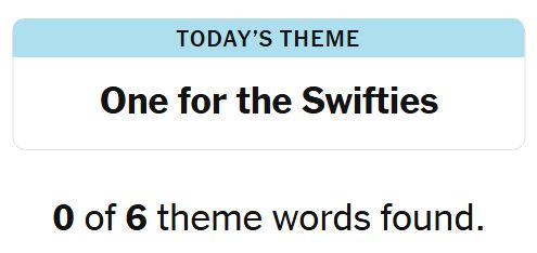 Today’s theme or hint for the puzzle is, “ONE FOR THE SWIFTIES” and there are six theme words to be found.
