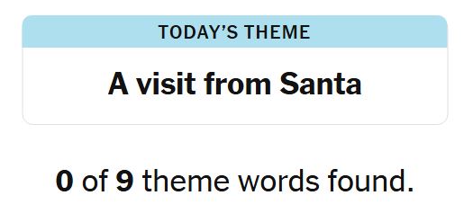 Today’s theme or hint for the puzzle is, “A VISIT FROM SANTA” and there are nine theme words to be found.