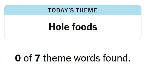 Today’s theme or hint for the puzzle is, “HOLE FOODS” and there are seven theme words to be found.