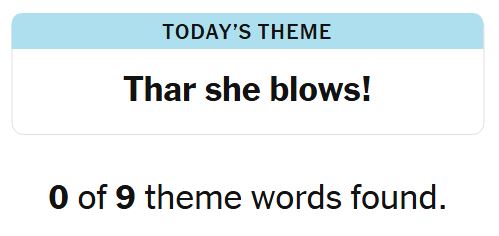 Today’s theme or hint for the puzzle is, “THAR SHE BLOWS!” and there are nine theme words to be found.