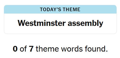 Today’s theme or hint for the puzzle is, “WESTMINSTER ASSEMBLY” and there are seven theme words to be found.