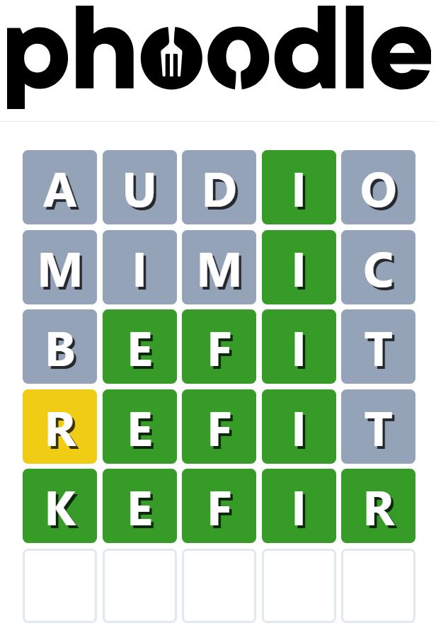 Phoodle is another Wordle-inspired game we have found, which is another food-related game. Players need to guess the five-letter food-related term, which can be anything from appliances to famous chefs and more.