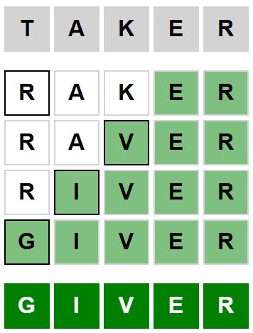 The starter word for the Weaver puzzle released today, December 10th 2024, is ‘TAKER‘ and the end word is ‘GIVER‘.