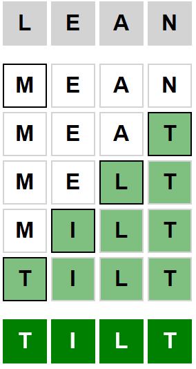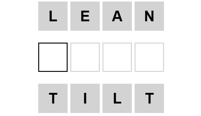 The starter word for the Weaver puzzle released today, December 4th 2024, is ‘LEAN‘ and the end word is ‘TILT‘.
