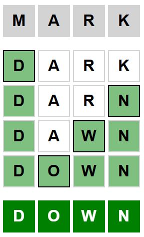 The starter word for the Weaver puzzle released today, February 10th 2024, is ‘MARK‘ and the end word is ‘DOWN‘.