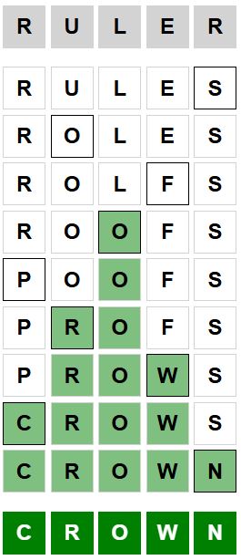 The starter word for the Weaver puzzle released today, February 16th 2024, is ‘RULER‘ and the end word is ‘CROWN‘.