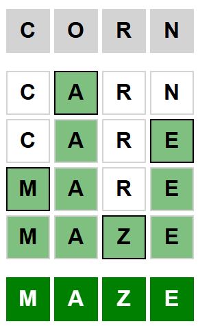 The starter word for the Weaver puzzle released today, February 17th 2024, is ‘CORN‘ and the end word is ‘MAZE‘.