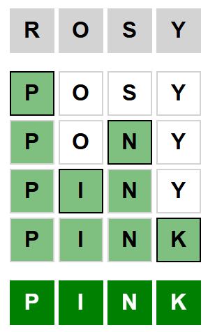 The starter word for the Weaver puzzle released today, January 20th 2024, is ‘ROSY‘ and the end word is ‘PINK‘.