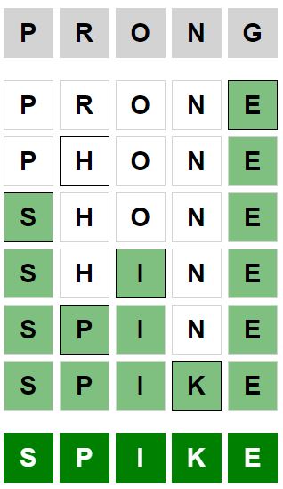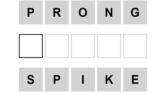 The starter word for the Weaver puzzle released today, October 10th 2024, is ‘PRONG‘ and the end word is ‘SPIKE‘.
