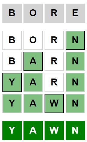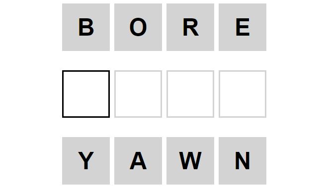 The starter word for the Weaver puzzle released today, October 14th 2024, is ‘BORE‘ and the end word is ‘YAWN‘.