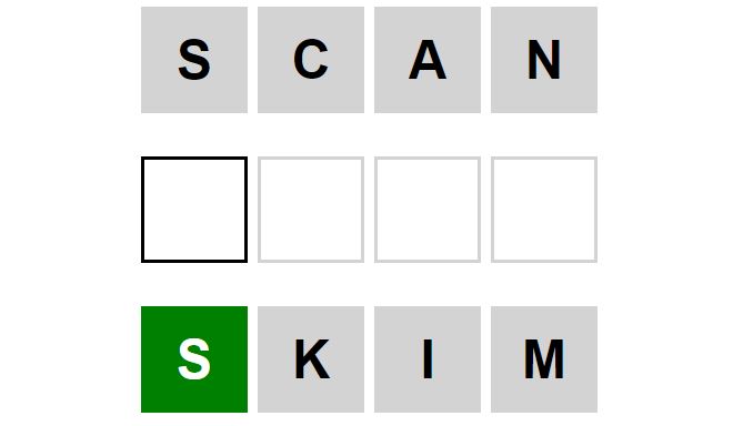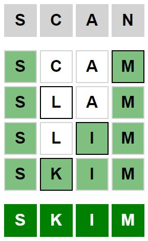 The starter word for the Weaver puzzle released today, October 7th 2024, is ‘SCAN‘ and the end word is ‘SKIM‘.