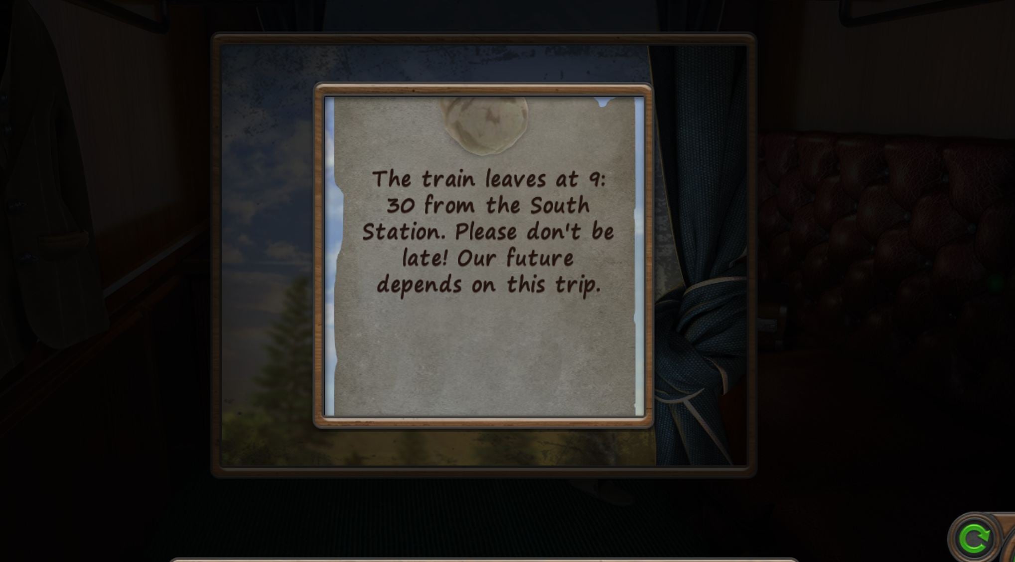 “Despite the charm of the landscapes sweeping outside the window, carved glass holders, and the smell of oil, you do not want to wait for this train to stop. Your path may be forever interrupted at the end station. There is no way to get off the moving train safely. You should figure out how to stop the train.“