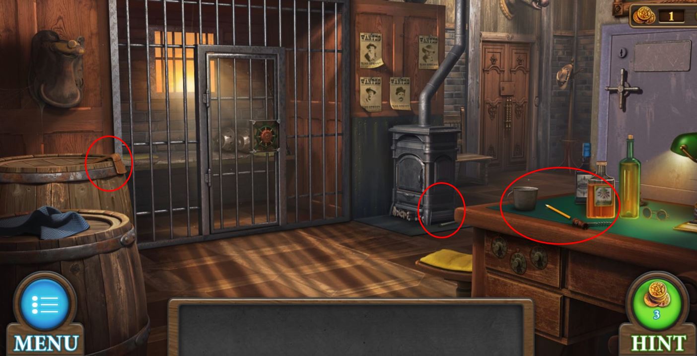 - Hammer – there is a fireplace/heater in the middle of the room, under the wanted posters. When you click on it to get a closer look, you will see the hammer lying on the floor on the right side.