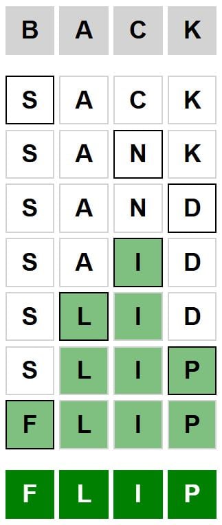 The starter word for the Weaver puzzle released today, October 17th 2025, is ‘BACK‘ and the end word is ‘FLIP‘.
