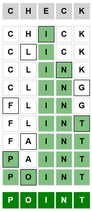 Here is the answer to the Weaver puzzle today, CHECK to POINT, released on August 31st 2025, and some hints to help you solve it.
